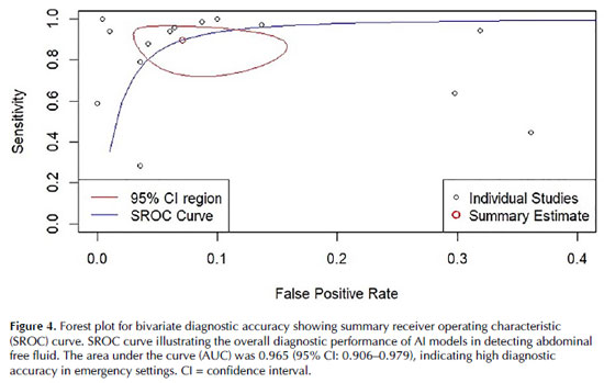 METHODS: A comprehensive literature search was conducted across PubMed, Cochrane Library, and Embase up until July 2024, adhering to PRISMA-DTA guidelines. Observational and randomized studies reporting diagnostic accuracy outcomes (sensitivity, specificity) of AI models for abdominal free fluid detection using ultrasonography in emergency cases were included. Key data extracted included study characteristics, patient demographics, AI model details, and diagnostic outcomes. Study quality was assessed using the QUADAS-2 tool. Meta-analyses using random-effects models calculated pooled sensitivity, specificity, and the summary receiver operating characteristic (SROC) curve. Heterogeneity was evaluated with the I2 statistic, and a leave-one-out sensitivity analysis assessed result robustness.