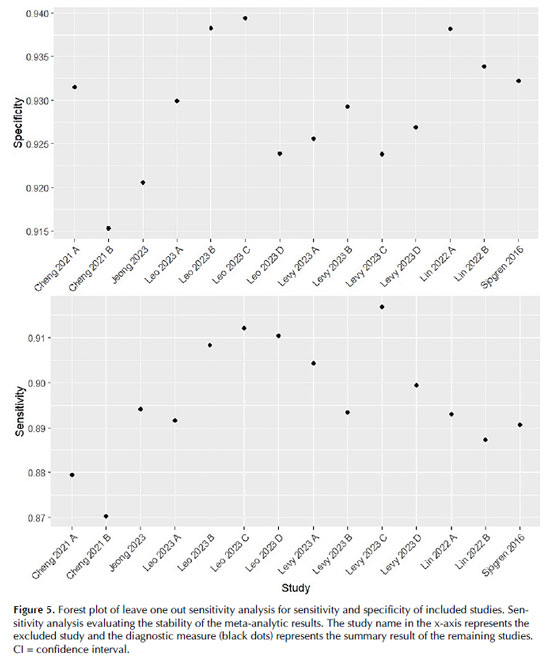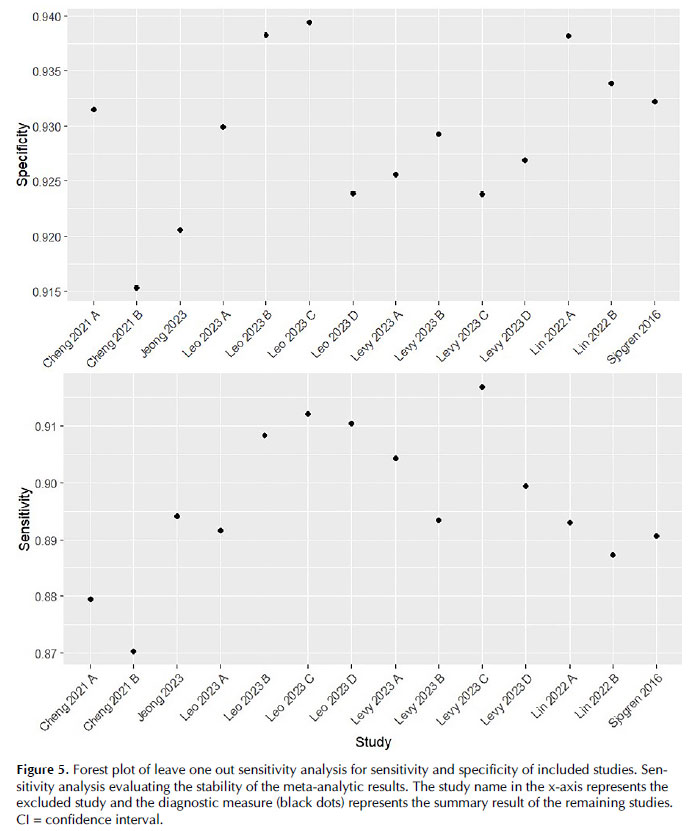 The leave-one-out sensitivity analysis demonstrates that the overall meta-analytic results are robust, with no individual study exerting an excessive influence on the summary estimates of sensitivity, specificity, or AUC. The small range of fluctuation in these values indicates that the pooled diagnostic accuracy measures are reliable and not dependent on any single study. The model remains consistent even when studies with large sample sizes or extreme values are excluded (Fig. 5).