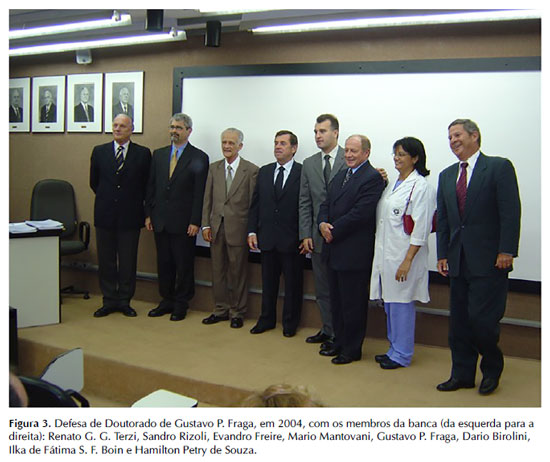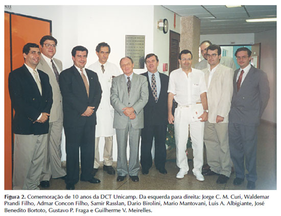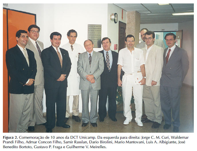 Em 1987, na FMUSP, o Prof. Dario Birolini criou a primeira área acadêmica no Brasil dedicada à Cirurgia do Trauma, com a aprovação como Professor Titular da Disciplina de Cirurgia do Trauma.25 Em 15 de janeiro de 1982 o Prof. Birolini fundou a Sociedade Brasileira de Atendimento Integrado ao Traumatizado (SBAIT), que em seu estatuto descreve no artigo 1o, parágrafo único: “A SBAIT é representativa da cirurgia do trauma perante organismos de saúde e previdência nacionais e internacionais”.26 No final de 1987, em Campinas, o Prof. Mario Mantovani criou a Disciplina de Cirurgia do Trauma (DCT) na Faculdade de Ciências Médicas (FCM) da Universidade Estadual de Campinas (Unicamp).27 A Figura 2 mostra os professores Samir Rasslan, Mario Mantovani, Dario Birolini e médicos assistentes da DCT na comemoração dos 10 anos de criação, em 1997.