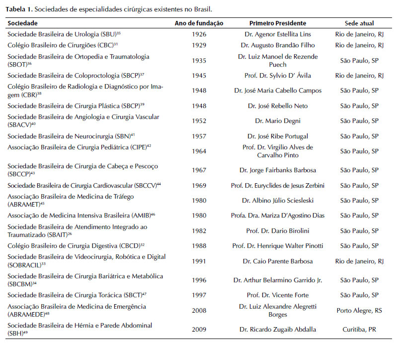 A Tabela 1 cita diversas sociedades de especialidades cirúrgicas existentes no Brasil, com o ano de criação e o nome do primeiro presidente. Todas essas sociedades listadas têm grande relação com a assistência de pacientes com urgências cirúrgicas traumáticas e não traumáticas.