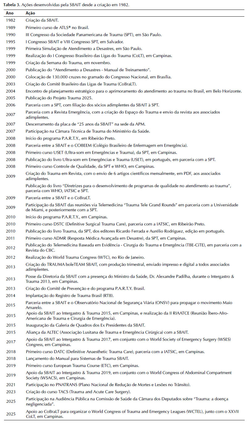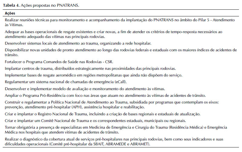 Em 2021 a SBAIT participou da elaboração do Plano Nacional de Redução de Mortes e Lesões no Trânsito (PNATRANS), cuja meta era no período de dez anos, reduzir no mínimo à metade o índice nacional de mortos no trânsito por grupo de veículos e o índice nacional de mortos no trânsito por grupo de habitantes.67-69 Pela SBAIT, Rodrigo Caselli Belém e Gustavo P. Fraga participaram do Pilar 5, de atendimento às vítimas, com a proposição de ações listadas na Tabela 4.67,68