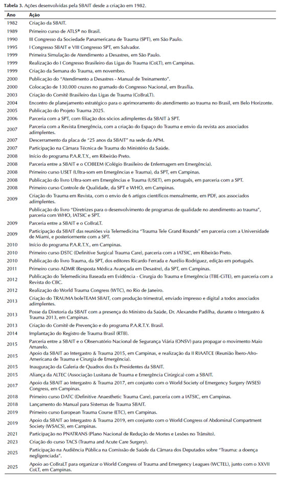 Entre os eventos, destaque para o World Congress of Trauma (WTC), que foi uma iniciativa da SBAIT, com o apoio de sociedades internacionais, e que reuniu 3.500 participantes no Rio de Janeiro, de 22 a 25 de Agosto de 2012.60 A abertura contou com a presença do Ministro da Saúde, Dr. Alexandre Padilha. O WTC teve como presidente o Prof. Raul Coimbra, egresso da Santa Casa de São Paulo, que atuou como professor da Universidade da Califórnia, San Diego, desde os anos 1990, Membro Honorário da SBAIT, e o congresso foi o evento precursor da World Coalition for Trauma Care (WCTC).61 O WTC passou a ser realizado nos anos pares em diferentes países: Alemanha (2014), Índia (2016), Estados Unidos da América - EUA (San Diego, 2018), online (2020, devido a pandemia do Covid-19), Japão (2022) e EUA (Las Vegas, 2024, embora esse congresso estivesse inicialmente programado para Salvador, Brasil, mas mudou após a pandemia do Covid-19). Em 2026 o WTC está programado para a Suécia, junto com o congresso da ESTES (European Society for Trauma and Emergency Surgery).61