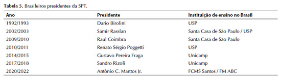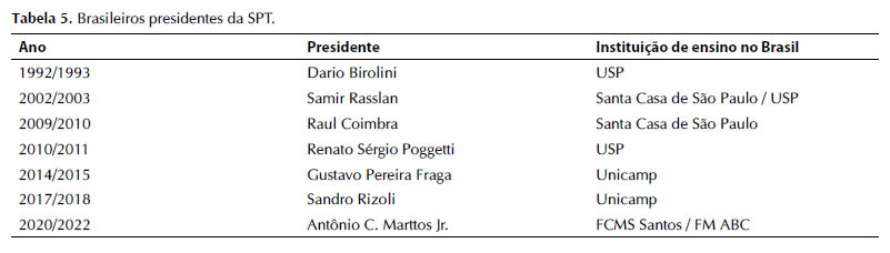 O Congresso da SPT passou a ser realizado em diferentes países e vários brasileiros já exerceram o cargo de Presidente da SPT, conforme a Tabela 5.70,71