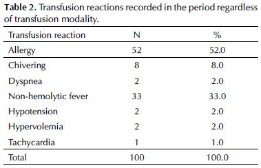 Despite the high number of requests and blood components prescribed, only 100 transfusion reactions were recorded, which alerts us to possible under-reporting. The most prevalent was the allergic reaction, with 52% of the cases, 34% mild, 14% moderate, and 4% severe. The other reactions are shown in table 2.