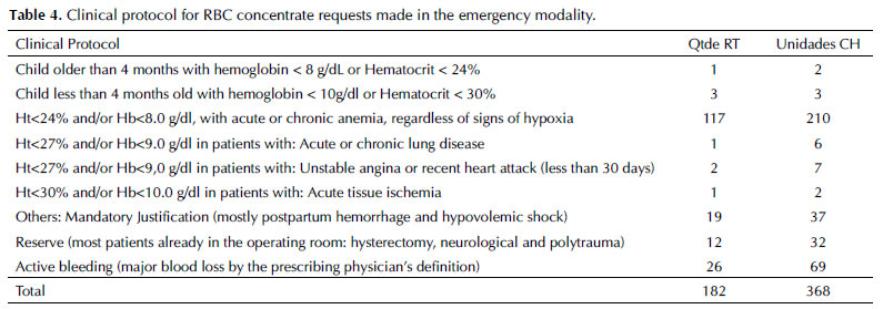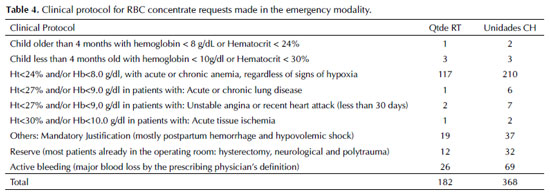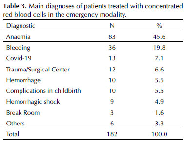 Although the rate of transfusions performed in the emergency setting corresponds to only 1.4% of the evaluated requests, we verified the profile of patients linked to 182 requests that prescribed 368 concentrated red blood cells. A total of 94 male patients, 82 female patients, and 06 newborns were analyzed. The median age was 54 years (0 to 98 years), with no statistical difference between genders. The main diagnoses and clinical protocols are shown in tables 3 and 4, respectively.