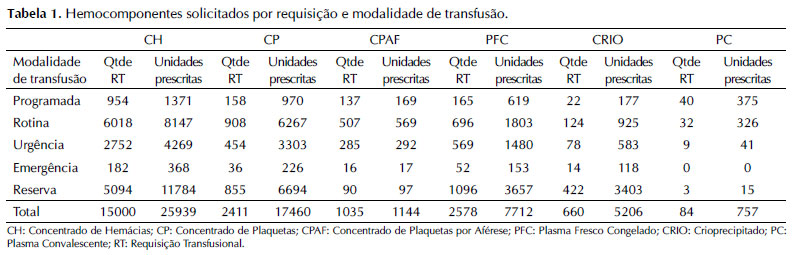 Foram registradas 21.768 requisições de transfusão no período estabelecido que resultaram na prescrição de 58.218 hemocomponentes para 13.823 pacientes. Dentre as requisições, 1.476 (6,8%) foram programadas, 8.285 (38,1%) de rotina, 4.147 (19,1%) de urgência, 300 (1,4%) de emergência e 7.560 (34,6%) reservas. A quantidade de hemocomponentes prescritos em cada modalidade está disposta na tabela 1.