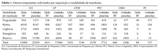RESULTADOS: Foram registradas 21.768 requisições de transfusão no período estabelecido que resultaram na prescrição de 58.218 hemocomponentes para 13.823 pacientes. Destas, somente 300 foram realizadas em caráter emergencial.