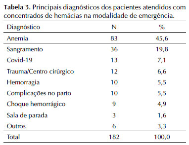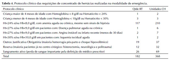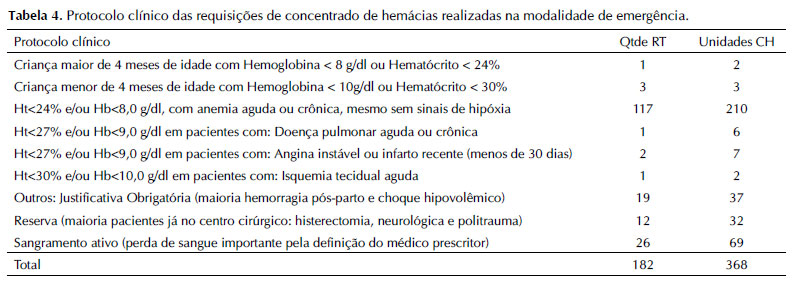 Embora a taxa de transfusões realizadas na modalidade de emergência corresponda a somente 1,4% das requisições avaliadas, verificamos o perfil dos pacientes vinculados a 182 requisições que prescreveram 368 concentrados de hemácias. Foram analisados 94 pacientes do sexo masculino, 82 pacientes do sexo feminino, e 06 recém-nascidos. A mediana de idade foi de 54 anos (0 a 98 anos), sem diferença estatística entre os gêneros. Os principais diagnósticos e protocolos clínicos estão dispostos respectivamente nas tabelas 3 e 4.